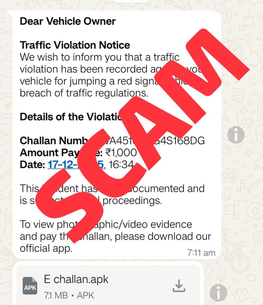 नई दिल्ली। आम लोगों की सुविधा के लिए सरकार की पहल से ट्रैफिक चालान समेत कई जरूरी सूचना व्हाट्सएप पर मिलने लगी है। लेकिन स्कैमरों की बुरी नजर व्हाट्सएप पर भेजे जाने वाले ट्रैफिक चालान पर भी पड़ गई है। ऐसे में वह फर्जी चालान के जरिये आपको बैठे-बिठाये लूट सकते हैं।
