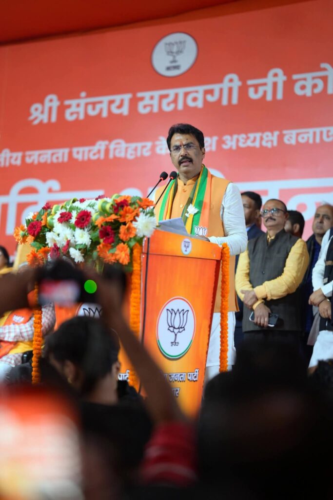 पटना। बिहार प्रदेश भारतीय जनता पार्टी (Bihar BJP) के नव नियुक्त प्रदेश अध्यक्ष संजय सरावगी (Sanjay saraogi) ने गुरुवार को भाजपा प्रदेश कार्यालय में प्रदेश अध्यक्ष का कार्यभार संभाल लिया। उन्होंने इस दायित्व के लिए प्रधानमंत्री नरेंद्र मोदी (Prime Minister Narendra Modi) , केंद्रीय गृह मंत्री अमित शाह (Home Minister Amit Shah) , राष्ट्रीय अध्यक्ष जे पी नड्डा (Jagat Prakash Nadda) और राष्ट्रीय कार्यकारी अध्यक्ष नितिन नबीन (Nitin Nabeen) का आभार जताते हुए कहा कि उन्होंने जो विश्वास कर दायित्व सौंपा है उसपर वे खरा उतरेंगे। इस मौके पर उप मुख्यमंत्री सम्राट चौधरी (Samrat Chaudhary) और विजय सिन्हा ( Vijay Sinha ) और निर्वतमान अध्यक्ष दिलीप जायसवाल (Dilip Jaiswal) सरावगी को शुभकामनाएं दीं।