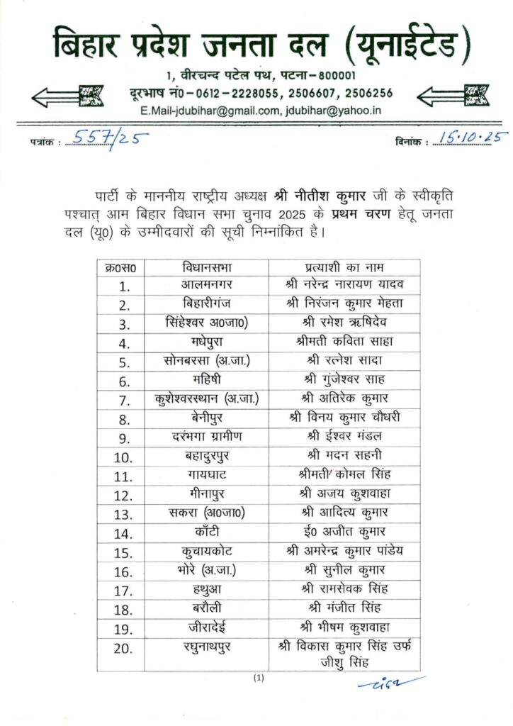 Bihar Election 2025: पटना। बिहार विधानसभा चुनाव 2025 को लेकर बुधवार का दिन सियासत के लिए बेहद अहम रहा। सत्ता धारी एनडीए गठबंधन की प्रमुख पार्टी जनता दल यूनाइटेड (JDU) ने अपने पहले चरण के 57 उम्मीदवारों की सूची जारी कर दी है। इस सूची में कई पुराने चेहरों को दोबारा मौका दिया गया है, जबकि कुछ सीटों पर बड़े बदलाव किए गए हैं। इसमें एक नाम गोपाल मंडल का भी है।