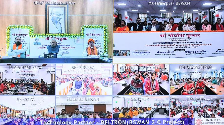 पटना। मुख्यमंत्री श्री नीतीश कुमार ने आज 1, अणे मार्ग स्थित ‘संकल्प सभागार’ से ‘मुख्यमंत्री महिला रोजगार योजना’ की 25 लाख लाभुक महिलाओं के खाते में 10 हजार रुपये प्रति लाभुक की दर से 2,500 करोड़ रुपये की राशि का रिमोट का बटन दबाकर अंतरण किया।