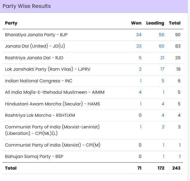 Bihar assembly election 2025: पटना। बिहार में विधानसभा चुनाव के नतीजे बेहद चौंकाने वाले आ रहे हैं। शुरुआती रुझानों में एनडीए 200 से अधिक सीटों पर बढ़त के साथ महागठबंधन का सूपड़ा साफ करते हुए महाविजय की ओर बढ़ रहा है। राजद महज 26 सीटों पर आगे है।
