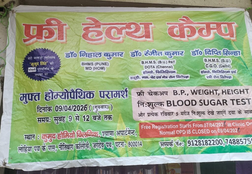 डॉक्टर निहाल ने 9 अप्रैल को जगदेव पथ के नजदीक लोहियापथ मेंं अपने क्लिनिक के पास मुफ्त कैंप लगाया है। डॉक्टर निहाल ने बताया कि मुफ्त कैंप के अलावा भी वह हर रविवार को 5 मरीजो का मुफ्त इलाज करते हैं। उनका कहना है ऐसा करके उनको दिल से बहुत खुशी मिलती है।