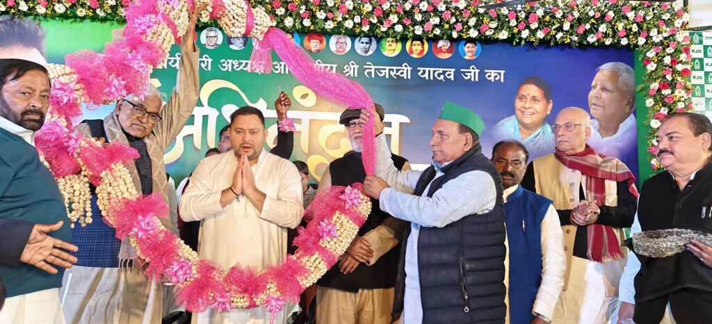 केन्द्र की सरकार जनता के मुद्दों से ध्यान भटकाने के लिए कार्य कर रही है। छोटे-छोटे व्यवसाय करने वालो को तंग किया जा रहा है और किसानों का उसका एमएसपी नहीं मिल पा रहा है। मोदी जी रील को ही रोजगार बता रहे हैं। नीतीश कुमार अधिकारियों के मुख्यमंत्री हैं, जनता के नहीं। इसलिए जनता का कोई काम डबल इंजन सरकार में नहीं हो रहे हैं। जो योजनाएं हमने चुनाव के पहले घोषणा की थी चाहे महिलाओं के संबंध में किसानों या युवाओं के संबंध में या नौकरी तथा रोजगार के लिए उन सभी योजनाओं को मजबुरी में ही बिहार में जो सरकार बनी है, उसे लागू करना होगा।इन्होंने कहा कि जो जनता के मुद्दे पर लड़ाई लड़ेंगे उस सभी में आपसभी का समर्थन और विश्वास मिलना चाहिए। सभी उपस्थित लोगों ने तेजस्वी जी के साथ संघर्ष और आन्दोलन के लिए हाथ उठाकर समर्थन और विश्वास का भरोसा दिया। इन्होंने कहा कि 17 फरवरी, 2026 को जननायक कर्पूरी ठाकुर जी की पुण्यतिथि के अवसर पर बापू सभागार में कर्पूरी ठाकुर पुण्यतिथि का आयोजन किया जायेगा।प्रदेश प्रवक्ता एजाज अहमद ने बताया कि तेजस्वी जी के कार्यालय आने से पहले झारखंड प्रदेश से आये हुए आलिया बैण्ड ने स्वागत किया और राजद महिला प्रकोष्ठ की ओर से कार्यकारी प्रदेश अध्यक्ष श्रीमती अनीता भारती के नेतृत्व में गुलाब के फूलों की पंखुड़ियों के साथ कार्यकारी अध्यक्ष का पारंपरिक तरीके से स्वागत किया। इस अवसर पर मुंबई के सुप्रसिद्ध गायकार विनोद गवार ने तेजस्व्ी जी के स्वागत में एक अलग तरह का शमां अपनी गायिकी से बांध दिया। तेजस्वी जी के अभिनंदन समारोह के लिए राजद कार्यालय को दुल्हन की तरह सजाया गया था और कार्यकर्ताओं के लिए भोजन के साथ नाश्ता, चाय, बिस्कुट, जिलेबी और सेव, बुनिया की व्यवस्था थी।इस अवसर पर पार्टी के सैंकड़ों नेताओं और कार्यकर्ताओं की उपस्थिति में नेताओं ने तेजस्वी प्रसाद यादव को पार्टी की ओर से मखाना का माला और शॉल देकर प्रदेश अध्यक्ष श्री मंगनी लाल मंडल जी की ओर से पार्टी नेताओं ने दिया। इस अवसर पर पार्टी के वरिष्ठ नेताओं ने शॉल और बुके देकर राष्ट्रीय कार्यकारी अध्यक्ष श्री उदय नारयण चौधरी, श्री अब्दुल बारी सिद्दिकी, डॉ0 रामचन्द्र पूर्वे, श्री अभय कुशवाहा, डॉ0 सुरेन्द्र प्रसाद यादव, श्री संजय यादव, श्रीमती अनीता देवी, श्री भोला यादव, श्री बीनू यादव, श्री अवध बिहारी चौधरी, डॉ0 सुनील कुमार सिंह, मो0 एम0 ए0 ए0 फातिमी, श्री जयप्रकश नारायण यादव, डॉ0 श्रीमती कांति सिंह, श्री अशोक कुमार सिंह, श्री आलोक कुमार मेहता, श्री प्रेमचन्द गुप्ता, श्री सर्वजीत पासवान, श्री कार्तिकेय सिंह, श्री महबूब अली कैसर, श्री शिवचन्द्र राम, मो0 इसराइल मंसुरी, डॉ0 मो0 समीम, डॉ0 उर्मिला ठाकुर, कुमार नागेन्द्र उर्फ रिंकू यादव, मो0 कारी स